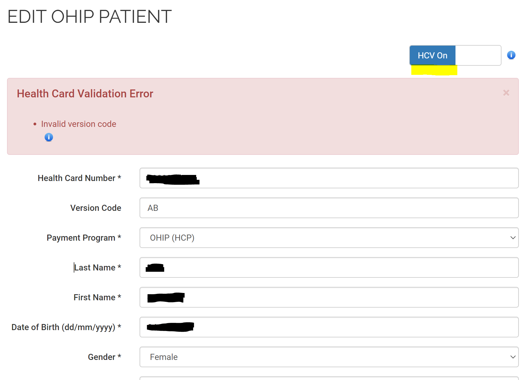 Ontario health card validation (ie rejected billing due to invalid health card)