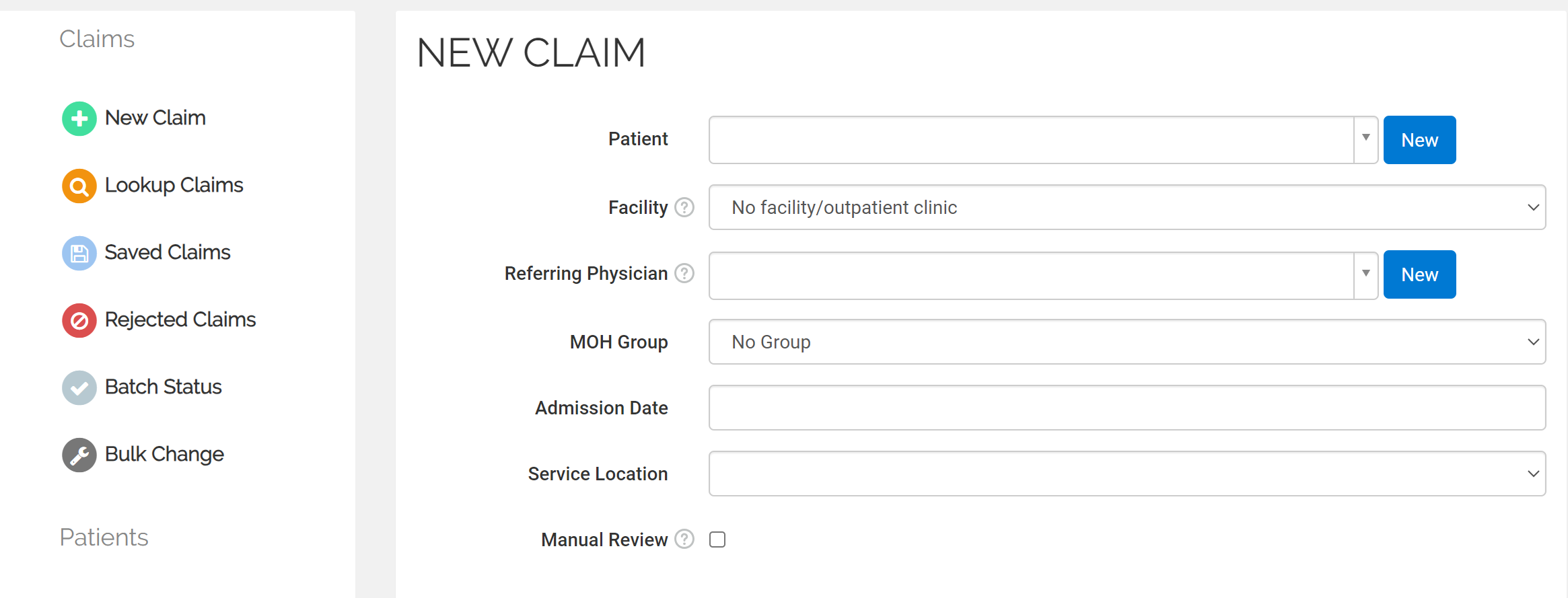 - Click "NEW CLAIM" (left toolbar) --> NEW patient (blue button on the right).