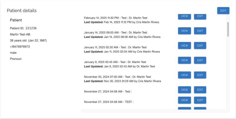 Patient Details - Here is where you can find a patient’s personal information and edit them, as well as details of previous appointments. Click the View button to access appointment-specific notes