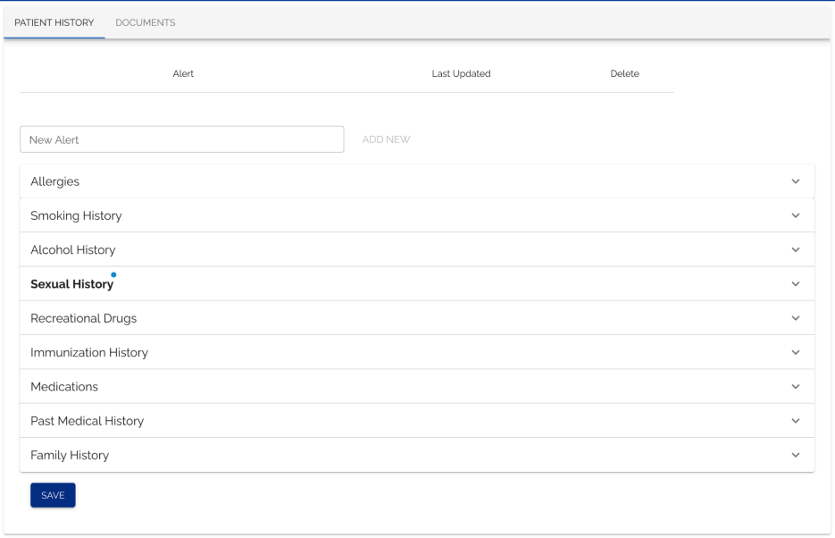 Patient History/Documents - Select medical history and chart alerts are under the Patient History tab, while documents can be viewed by switching to the Documents tab.